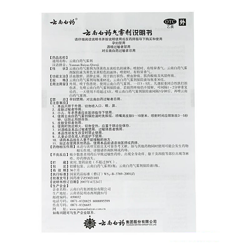 【商品名称】:云南白药气雾剂