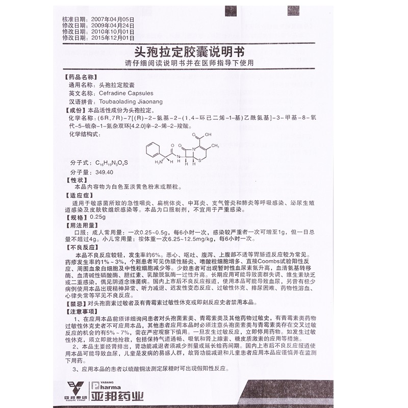 【商品名称】:头孢拉定胶囊(亚邦*)